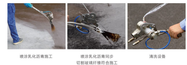 ●  噴涂乳化瀝青同步切割玻璃纖維復合施工,大大提高了防水層的抗拉強度,同時形成的是無接縫的整體彈性橡膠涂膜。